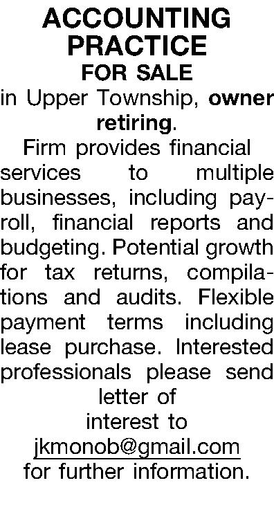 ACCOUNTING PRACTICE FOR SALE in Upper Township, owner retiring. Firm provides financial services to multiple businesses, including payroll, financial reports and budgeting. Potential growth for tax returns, compilations and audits. Flexible payment terms including lease purchase. Interested professionals please send letter of interest to jkmonob@gmail.com for further information.