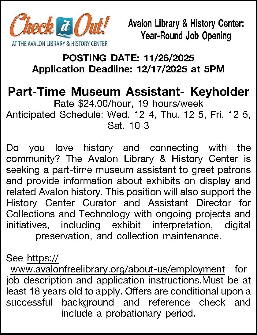 Avalon Library & History Center: Year-Round Job Opening POSTING DATE: 11/26/2025 Application Deadline: 12/17/2025 at 5PM Part-Time Museum Assistant-Keyholder Rate $24.00/hour, 19 hours/week Anticipated Schedule: Wed. 12-4, Thu. 12-5, Fri. 12-5, Sat. 10-3 Do you love history and connecting with the community? The Avalon Library & History Center is seeking a part-time museum assistant to greet patrons and provide information about exhibits on display and related Avalon history. This position will also support the History Center Curator and Assistant Director for Collections and Technology with ongoing projects and initiatives, including exhibit interpretation, digital preservation, and collection maintenance. See https:// www.avalonfreelibrary.org/about-us/employmentfor job description and application instructions.Must be at least 18 years old to apply. Offers are conditional upon a successful background and reference check and include a probationary period.