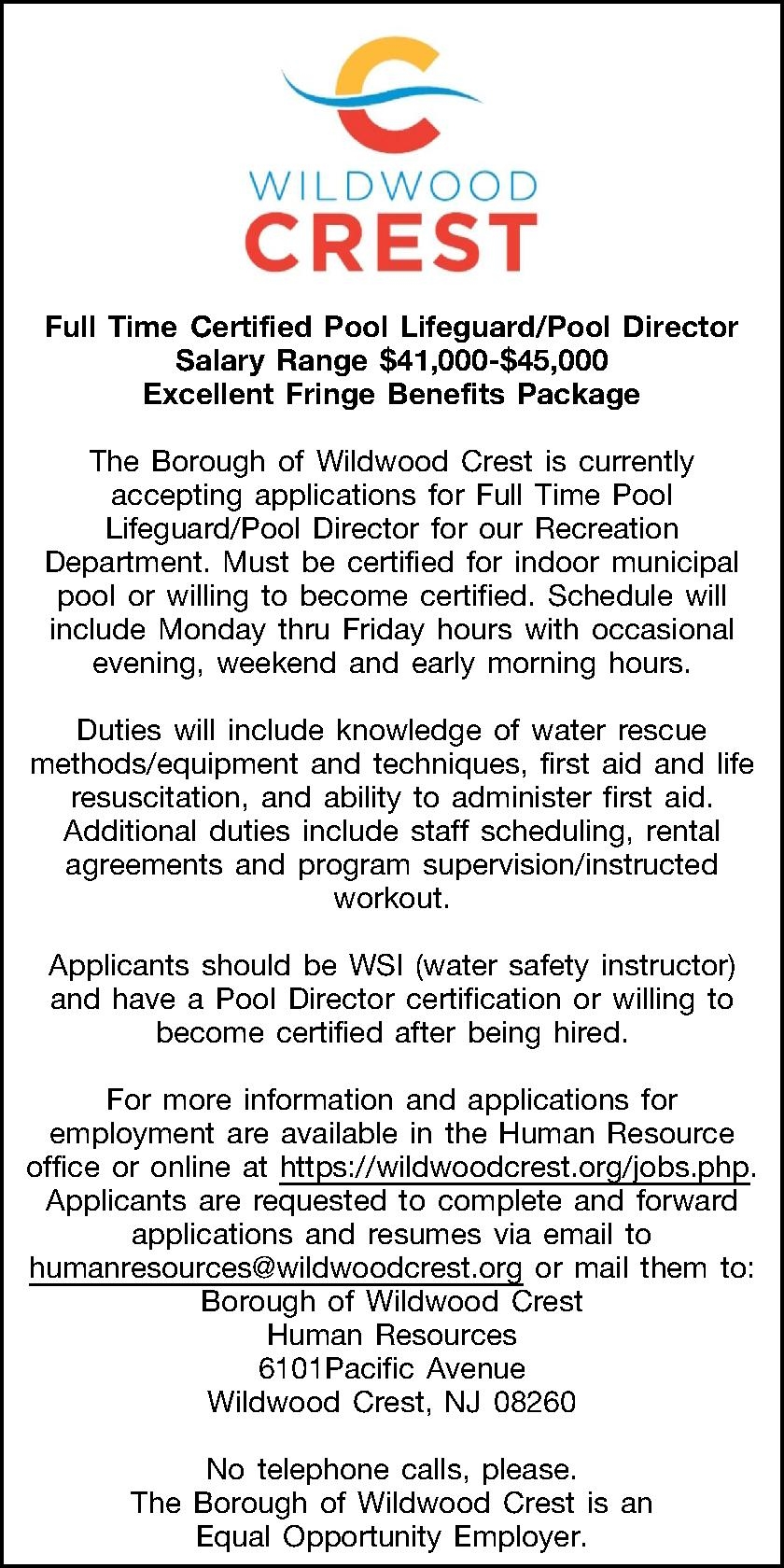 Full Time Certified Pool Lifeguard/Pool Director Salary Range $41,000-$45,000 Excellent Fringe Benefits Package The Borough of Wildwood Crest is currently accepting applications for Full Time Pool Lifeguard/Pool Director for our Recreation Department. Must be certified for indoor municipal pool or willing to become certified. Schedule will include Monday thru Friday hours with occasional evening, weekend and early morning hours. Duties will include knowledge of water rescue methods/equipment and techniques, first aid and life resuscitation, and ability to administer first aid. Additional duties include staff scheduling, rental agreements and program supervision/instructed workout. Applicants should be WSI (water safety instructor) and have a Pool Director certification or willing to become certified after being hired. For more information and applications for employment are available in the Human Resource office or online at https://wildwoodcrest.org/jobs.php. Applicants are requested to complete and forward applications and resumes via email to humanresources@wildwoodcrest.org or mail them to: Borough of Wildwood Crest Human Resources 6101Pacific Avenue Wildwood Crest, NJ 08260 No telephone calls, please. The Borough of Wildwood Crest is an Equal Opportunity Employer.