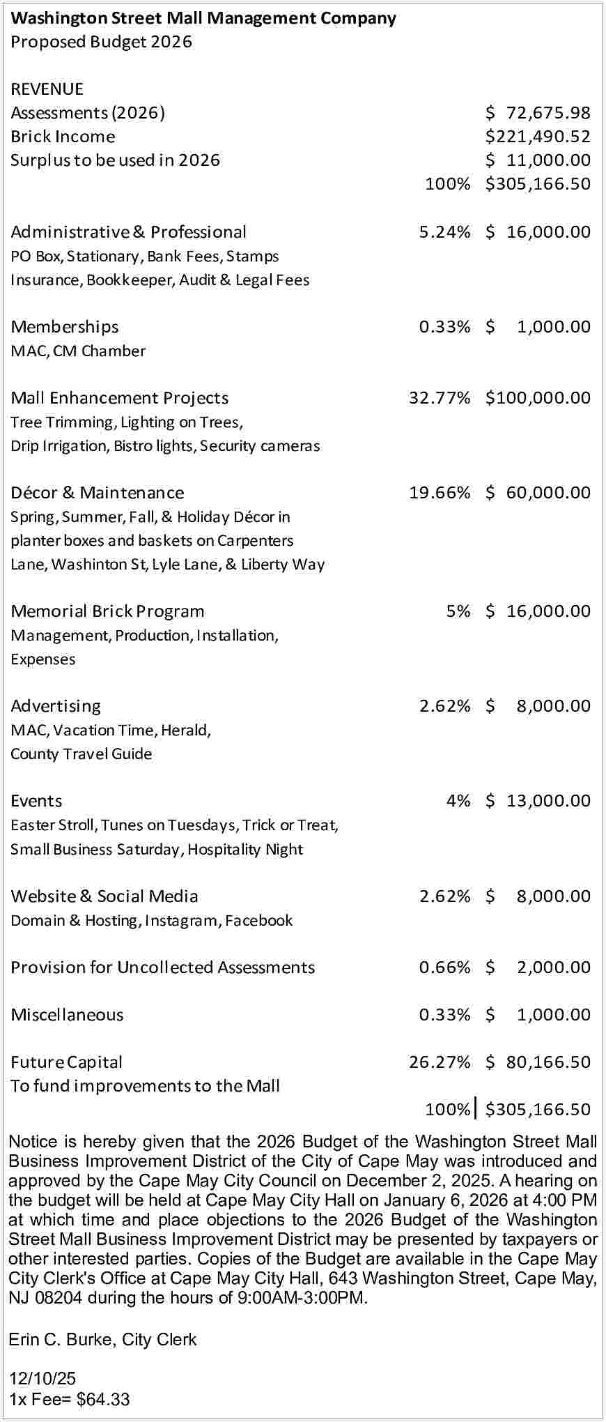 PUBLIC NOTICE OF THE 2026 BUDGET HEARING FOR THE COMMISSIONERS OF FIRE DISTRICT NO. 3 IN THE TOWNSHIP OF MIDDLE, COUNTY OF CAPE MAY PLEASE TAKE NOTICE that the Commissioners of Fire District No. 3 in the Township of Middle, County of Cape May, pursuant to New Jersey statutory law, shall hold a public hearing relative to the proposed 2026 Annual Budget for the fire district on December 29, 2025, at 5:30 p.m. at the Green Creek Firehouse, 14 Bayshore Road, Green Creek, NJ 08219. The purpose of the budget hearing is to provide any and all taxpayers of the fire district and all persons having an interest therein an opportunity to present objections to the said annual budget prior to its final adoption by the Commissioners. Final adoption of the budget by the Commissioners may occur at this meeting on December 29, 2025, after the closing of the hearing concerning said budget. Said budget may be adopted in that exact form as previously approved by the Commissioners or may be amended during or after the public hearing concerning the budget. A copy of said proposed annual budget, which was previously approved by the Commissioners at a regular meeting, said meeting having been duly advertised in accordance with the Open Public Meeting Act of the State of New Jersey, shall be available to each and every person requesting same during the week preceding said public hearing and may be obtained from the Commissioners attorney, Richard M. Braslow, 516 Fielders Lane, Toms River, New Jersey, 08755, (732) 604-7517, Monday through Friday, between the hours of 9:00 a.m. and 5:00 p.m. The Commissioners of Fire District No. 3 Township of Middle, County of Cape May 1x Fee= $21.01 12/3/25