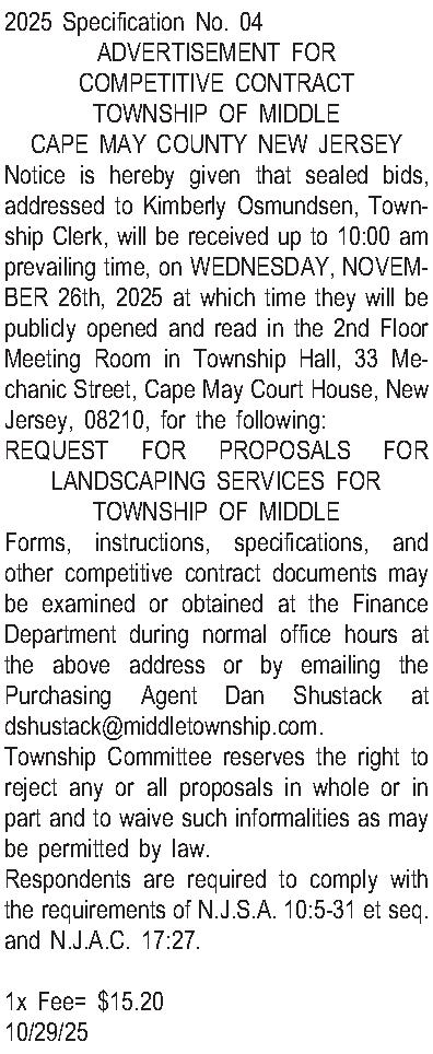 2025 Specification No. 04 ADVERTISEMENT FOR COMPETITIVE CONTRACT TOWNSHIP OF MIDDLE CAPE MAY COUNTY NEW JERSEY Notice is hereby given that sealed bids, addressed to Kimberly Osmundsen, Township Clerk, will be received up to 10:00 am prevailing time, on WEDNESDAY, NOVEMBER 26th, 2025 at which time they will be publicly opened and read in the 2nd Floor Meeting Room in Township Hall, 33 Mechanic Street, Cape May Court House, New Jersey, 08210, for the following: REQUEST FOR PROPOSALS FOR LANDSCAPING SERVICES FOR TOWNSHIP OF MIDDLE Forms, instructions, specifications, and other competitive contract documents may be examined or obtained at the Finance Department during normal office hours at the above address or by emailing the Purchasing Agent Dan Shustack at dshustack@middletownship.com. Township Committee reserves the right to reject any or all proposals in whole or in part and to waive such informalities as may be permitted by law. Respondents are required to comply with the requirements of N.J.S.A. 10:5-31 et seq. and N.J.A.C. 17:27. 1x Fee= $15.20 10/29/25