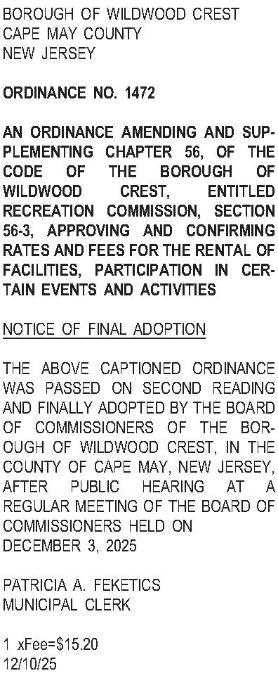 BOROUGH OF WILDWOOD CREST CAPE MAY COUNTY NEW JERSEY ORDINANCE NO. 1472 AN ORDINANCE AMENDING AND SUPPLEMENTING CHAPTER 56, OF THE CODE OF THE BOROUGH OF WILDWOOD CREST, ENTITLED RECREATION COMMISSION, SECTION 56-3, APPROVING AND CONFIRMING RATES AND FEES FOR THE RENTAL OF FACILITIES, PARTICIPATION IN CERTAIN EVENTS AND ACTIVITIES NOTICE OF FINAL ADOPTION THE ABOVE CAPTIONED ORDINANCE WAS PASSED ON SECOND READING AND FINALLY ADOPTED BY THE BOARD OF COMMISSIONERS OF THE BOROUGH OF WILDWOOD CREST, IN THE COUNTY OF CAPE MAY, NEW JERSEY, AFTER PUBLIC HEARING AT A REGULAR MEETING OF THE BOARD OF COMMISSIONERS HELD ON DECEMBER 3, 2025 PATRICIA A. FEKETICS MUNICIPAL CLERK 1 xFee=$15.20 12/10/25
