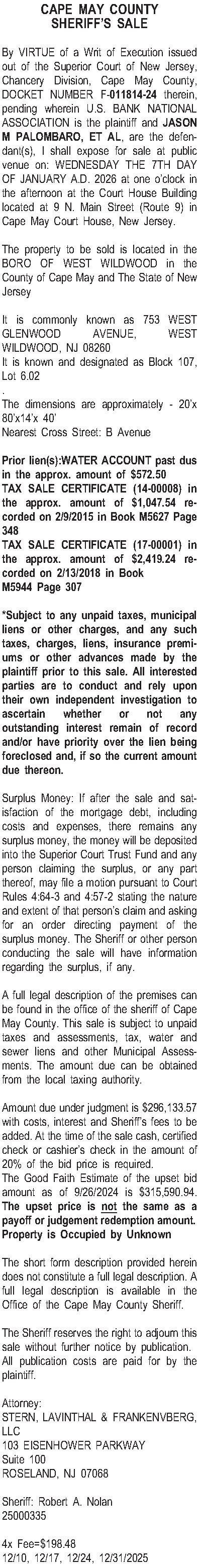 CAPE MAY COUNTY SHERIFFS SALE By VIRTUE of a Writ of Execution issued out of the Superior Court of New Jersey, Chancery Division, Cape May County, DOCKET NUMBER F-011814-24 therein, pending wherein U.S. BANK NATIONAL ASSOCIATION is the plaintiff and JASON M PALOMBARO, ET AL, are the defendant(s), I shall expose for sale at public venue on: WEDNESDAY THE 7TH DAY OF JANUARY A.D. 2026 at one oclock in the afternoon at the Court House Building located at 9 N. Main Street (Route 9) in Cape May Court House, New Jersey. The property to be sold is located in the BORO OF WEST WILDWOOD in the County of Cape May and The State of New Jersey It is commonly known as 753 WEST GLENWOOD AVENUE, WEST WILDWOOD, NJ 08260 It is known and designated as Block 107, Lot 6.02 . The dimensions are approximately - 20x 80x14x 40 Nearest Cross Street: B Avenue Prior lien(s):WATER ACCOUNT past dus in the approx. amount of $572.50 TAX SALE CERTIFICATE (14-00008) in the approx. amount of $1,047.54 recorded on 2/9/2015 in Book M5627 Page 348 TAX SALE CERTIFICATE (17-00001) in the approx. amount of $2,419.24 recorded on 2/13/2018 in Book M5944 Page 307 *Subject to any unpaid taxes, municipal liens or other charges, and any such taxes, charges, liens, insurance premiums or other advances made by the plaintiff prior to this sale. All interested parties are to conduct and rely upon their own independent investigation to ascertain whether or not any outstanding interest remain of record and/or have priority over the lien being foreclosed and, if so the current amount due thereon. Surplus Money: If after the sale and satisfaction of the mortgage debt, including costs and expenses, there remains any surplus money, the money will be deposited into the Superior Court Trust Fund and any person claiming the surplus, or any part thereof, may file a motion pursuant to Court Rules 4:64-3 and 4:57-2 stating the nature and extent of that persons claim and asking for an order directing payment of the surplus money. The Sheriff or other person conducting the sale will have information regarding the surplus, if any. A full legal description of the premises can be found in the office of the sheriff of Cape May County. This sale is subject to unpaid taxes and assessments, tax, water and sewer liens and other Municipal Assessments. The amount due can be obtained from the local taxing authority. Amount due under judgment is $296,133.57 with costs, interest and Sheriffs fees to be added. At the time of the sale cash, certified check or cashiers check in the amount of 20% of the bid price is required. The Good Faith Estimate of the upset bid amount as of 9/26/2024 is $315,590.94. The upset price is not the same as a payoff or judgement redemption amount. Property is Occupied by Unknown The short form description provided herein does not constitute a full legal description. A full legal description is available in the Office of the Cape May County Sheriff. The Sheriff reserves the right to adjourn this sale without further notice by publication. All publication costs are paid for by the plaintiff. Attorney: STERN, LAVINTHAL & FRANKENVBERG, LLC 103 EISENHOWER PARKWAY Suite 100 ROSELAND, NJ 07068 Sheriff: Robert A. Nolan 25000335 4x Fee=$198.48 12/10, 12/17, 12/24, 12/31/2025