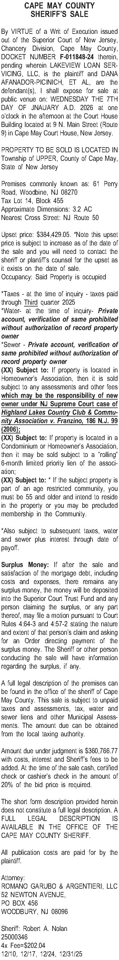 CAPE MAY COUNTY SHERIFFS SALE By VIRTUE of a Writ of Execution issued out of the Superior Court of New Jersey, Chancery Division, Cape May County, DOCKET NUMBER F-011848-24 therein, pending wherein LAKEVIEW LOAN SERVICING, LLC, is the plaintiff and DANA AFANADOR-PICINICH, ET AL, are the defendant(s), I shall expose for sale at public venue on: WEDNESDAY THE 7TH DAY OF JNAUARY A.D. 2026 at one oclock in the afternoon at the Court House Building located at 9 N. Main Street (Route 9) in Cape May Court House, New Jersey. PROPERTY TO BE SOLD IS LOCATED IN Township of UPPER, County of Cape May, State of New Jersey Premises commonly known as: 61 Perry Road, Woodbine, NJ 08270 Tax Lot 14, Block 455 Approximate Dimensions: 3.2 AC Nearest Cross Street: NJ Route 50 Upset price: $384,429.05. *Note this upset price is subject to increase as of the date of the sale and you will need to contact the sheriff or plantiffs counsel for the upset as it exists on the date of sale. Occupancy: Said Property is occupied *Taxes - at the time of inquiry - taxes paid through Third quarter 2025 *Water-at the time of inquiry- Private account, verification of same prohibited without authorization of record property owner *Sewer - Private account, verification of same prohibited without authorization of record property owner (XX) Subject to: If property is located in Homeowners Association, then it is sold subject to any assessments and other fees which may be the responsibility of new owner under NJ Supreme Court case of Highland Lakes Country Club & Community Association v. Franzino, 186 N.J. 99 (2006); (XX) Subject to: If property is located in a Condominium or Homeowners Association, then it may be sold subject to a rolling 6-month limited priority lien of the association; (XX) Subject to: * If the subject property is part of an age restricted community, you must be 55 and older and intend to reside in the property or you may be precluded membership in the Community. *Also subject to subsequent taxes, water and sewer plus interest through date of payoff. Surplus Money: If after the sale and satisfaction of the mortgage debt, including costs and expenses, there remains any surplus money, the money will be deposited into the Superior Court Trust Fund and any person claiming the surplus, or any part thereof, may file a motion pursuant to Court Rules 4:64-3 and 4:57-2 stating the nature and extent of that persons claim and asking for an Order directing payment of the surplus money. The Sheriff or other person conducting the sale will have information regarding the surplus, if any. A full legal description of the premises can be found in the office of the sheriff of Cape May County. This sale is subject to unpaid taxes and assessments, tax, water and sewer liens and other Municipal Assessments. The amount due can be obtained from the local taxing authority. Amount due under judgment is $360,766.77 with costs, interest and Sheriffs fees to be added. At the time of the sale cash, certified check or cashiers check in the amount of 20% of the bid price is required. The short form description provided herein does not constitute a full legal description. A FULL LEGAL DESCRIPTION IS AVAILABLE IN THE OFFICE OF THE CAPE MAY COUNTY SHERIFF. All publication costs are paid for by the plaintiff. Attorney: ROMANO GARUBO & ARGENTIERI, LLC 52 NEWTON AVENUE, PO BOX 456 WOODBURY, NJ 08096 Sheriff: Robert A. Nolan 25000346 4x Fee=$202.04 12/10, 12/17, 12/24, 12/31/25