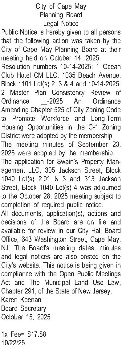 City of Cape May Planning Board Legal Notice Public Notice is hereby given to all persons that the following action was taken by the City of Cape May Planning Board at their meeting held on October 14, 2025: Resolution numbers 10-14-2025: 1 Ocean Club Hotel CM LLC, 1035 Beach Avenue, Block 1101 Lot(s) 2, 3 & 4 and 10-14-2025: 2 Master Plan Consistency Review of Ordinance __-2025 An Ordinance Amending Chapter 525 of City Zoning Code to Promote Workforce and Long-Term Housing Opportunities in the C-1 Zoning District were adopted by the membership. The meeting minutes of September 23, 2025 were adopted by the membership. The application for Swains Property Management LLC, 305 Jackson Street, Block 1040 Lot(s) 2.01 & 3 and 313 Jackson Street, Block 1040 Lot(s) 4 was adjourned to the October 28, 2025 meeting subject to completion of required public notice. All documents, application(s), actions and decisions of the Board are on file and available for review in our City Hall Board Office, 643 Washington Street, Cape May, NJ. The Boards meeting dates, minutes and legal notices are also posted on the Citys website. This notice is being given in compliance with the Open Public Meetings Act and The Municipal Land Use Law, Chapter 291, of the State of New Jersey. Karen Keenan Board Secretary October 15, 2025 1x Fee= $17.88 10/22/25