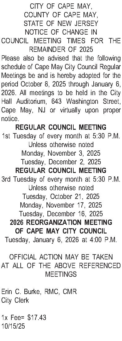 CITY OF CAPE MAY, COUNTY OF CAPE MAY, STATE OF NEW JERSEY NOTICE OF CHANGE IN COUNCIL MEETING TIMES FOR THE REMAINDER OF 2025 Please also be advised that the following schedule of Cape May City Council Regular Meetings be and is hereby adopted for the period October 8, 2025 through January 6, 2026. All meetings to be held in the City Hall Auditorium, 643 Washington Street, Cape May, NJ or virtually upon proper notice. REGULAR COUNCIL MEETING 1st Tuesday of every month at 5:30 P.M. Unless otherwise noted Monday, November 3, 2025 Tuesday, December 2, 2025 REGULAR COUNCIL MEETING 3rd Tuesday of every month at 5:30 P.M. Unless otherwise noted Tuesday, October 21, 2025 Monday, November 17, 2025 Tuesday, December 16, 2025 2026 REORGANIZATION MEETING OF CAPE MAY CITY COUNCIL Tuesday, January 6, 2026 at 4:00 P.M. OFFICIAL ACTION MAY BE TAKEN AT ALL OF THE ABOVE REFERENCED MEETINGS Erin C. Burke, RMC, CMR City Clerk 1x Fee= $17.43 10/15/25