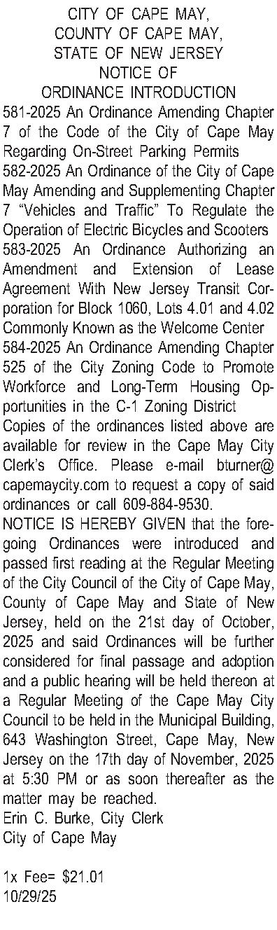 CITY OF CAPE MAY, COUNTY OF CAPE MAY, STATE OF NEW JERSEY NOTICE OF ORDINANCE INTRODUCTION 581-2025 An Ordinance Amending Chapter 7 of the Code of the City of Cape May Regarding On-Street Parking Permits 582-2025 An Ordinance of the City of Cape May Amending and Supplementing Chapter 7 Vehicles and Traffic To Regulate the Operation of Electric Bicycles and Scooters 583-2025 An Ordinance Authorizing an Amendment and Extension of Lease Agreement With New Jersey Transit Corporation for Block 1060, Lots 4.01 and 4.02 Commonly Known as the Welcome Center 584-2025 An Ordinance Amending Chapter 525 of the City Zoning Code to Promote Workforce and Long-Term Housing Opportunities in the C-1 Zoning District Copies of the ordinances listed above are available for review in the Cape May City Clerks Office. Please e-mail bturner@capemaycity.com to request a copy of said ordinances or call 609-884-9530. NOTICE IS HEREBY GIVEN that the foregoing Ordinances were introduced and passed first reading at the Regular Meeting of the City Council of the City of Cape May, County of Cape May and State of New Jersey, held on the 21st day of October, 2025 and said Ordinances will be further considered for final passage and adoption and a public hearing will be held thereon at a Regular Meeting of the Cape May City Council to be held in the Municipal Building, 643 Washington Street, Cape May, New Jersey on the 17th day of November, 2025 at 5:30 PM or as soon thereafter as the matter may be reached. Erin C. Burke, City Clerk City of Cape May 1x Fee= $21.01 10/29/25