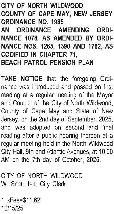 CITY OF NORTH WILDWOOD COUNTY OF CAPE MAY, NEW JERSEY ORDINANCE NO. 1985 AN ORDINANCE AMENDING ORDINANCE 1078, AS AMENDED BY ORDINANCE NOS. 1265, 1390 AND 1762, AS CODIFIED IN CHAPTER 71, BEACH PATROL PENSION PLAN TAKE NOTICE that the foregoing Ordinance was introduced and passed on first reading at a regular meeting of the Mayor and Council of the City of North Wildwood, County of Cape May and State of New Jersey, on the 2nd day of September, 2025, and was adopted on second and final reading after a public hearing thereon at a regular meeting held in the North Wildwood City Hall, 9th and Atlantic Avenues, at 10:00 AM on the 7th day of October, 2025. CITY OF NORTH WILDWOOD W. Scott Jett, City Clerk 1 xFee=$11.62 10/15/25