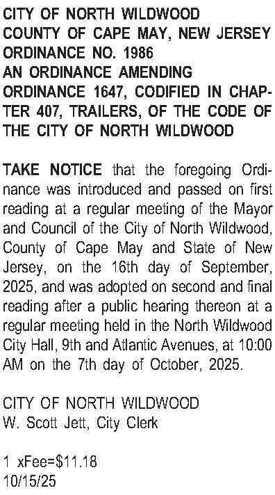 CITY OF NORTH WILDWOOD COUNTY OF CAPE MAY, NEW JERSEY ORDINANCE NO. 1986 AN ORDINANCE AMENDING ORDINANCE 1647, CODIFIED IN CHAPTER 407, TRAILERS, OF THE CODE OF THE CITY OF NORTH WILDWOOD TAKE NOTICE that the foregoing Ordinance was introduced and passed on first reading at a regular meeting of the Mayor and Council of the City of North Wildwood, County of Cape May and State of New Jersey, on the 16th day of September, 2025, and was adopted on second and final reading after a public hearing thereon at a regular meeting held in the North Wildwood City Hall, 9th and Atlantic Avenues, at 10:00 AM on the 7th day of October, 2025. CITY OF NORTH WILDWOOD W. Scott Jett, City Clerk 1 xFee=$11.18 10/15/25