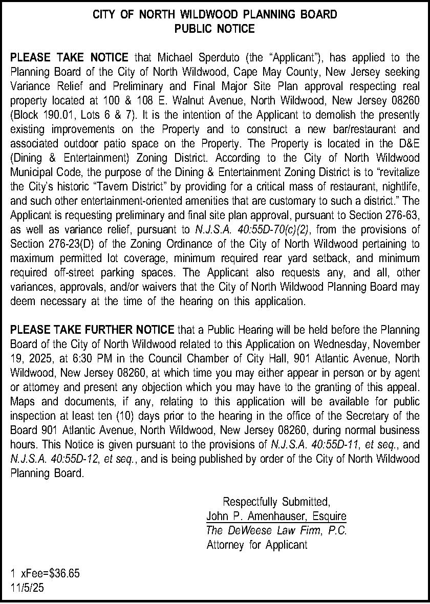 CITY OF NORTH WILDWOOD PLANNING BOARD PUBLIC NOTICE PLEASE TAKE NOTICE that Michael Sperduto (the Applicant), has applied to the Planning Board of the City of North Wildwood, Cape May County, New Jersey seeking Variance Relief and Preliminary and Final Major Site Plan approval respecting real property located at 100 & 108 E. Walnut Avenue, North Wildwood, New Jersey 08260 (Block 190.01, Lots 6 & 7). It is the intention of the Applicant to demolish the presently existing improvements on the Property and to construct a new bar/restaurant and associated outdoor patio space on the Property. The Property is located in the D&E (Dining & Entertainment) Zoning District. According to the City of North Wildwood Municipal Code, the purpose of the Dining & Entertainment Zoning District is to revitalize the Citys historic Tavern District by providing for a critical mass of restaurant, nightlife, and such other entertainment-oriented amenities that are customary to such a district. The Applicant is requesting preliminary and final site plan approval, pursuant to Section 276-63, as well as variance relief, pursuant to N.J.S.A. 40:55D-70(c)(2), from the provisions of Section 276-23(D) of the Zoning Ordinance of the City of North Wildwood pertaining to maximum permitted lot coverage, minimum required rear yard setback, and minimum required off-street parking spaces. The Applicant also requests any, and all, other variances, approvals, and/or waivers that the City of North Wildwood Planning Board may deem necessary at the time of the hearing on this application. PLEASE TAKE FURTHER NOTICE that a Public Hearing will be held before the Planning Board of the City of North Wildwood related to this Application on Wednesday, November 19, 2025, at 6:30 PM in the Council Chamber of City Hall, 901 Atlantic Avenue, North Wildwood, New Jersey 08260, at which time you may either appear in person or by agent or attorney and present any objection which you may have to the granting of this appeal. Maps and documents, if any, relating to this application will be available for public inspection at least ten (10) days prior to the hearing in the office of the Secretary of the Board 901 Atlantic Avenue, North Wildwood, New Jersey 08260, during normal business hours. This Notice is given pursuant to the provisions of N.J.S.A. 40:55D-11, et seq., and N.J.S.A. 40:55D-12, et seq., and is being published by order of the City of North Wildwood Planning Board. Respectfully Submitted, John P. Amenhauser, Esquire The DeWeese Law Firm, P.C. Attorney for Applicant 1 xFee=$36.65 11/5/25