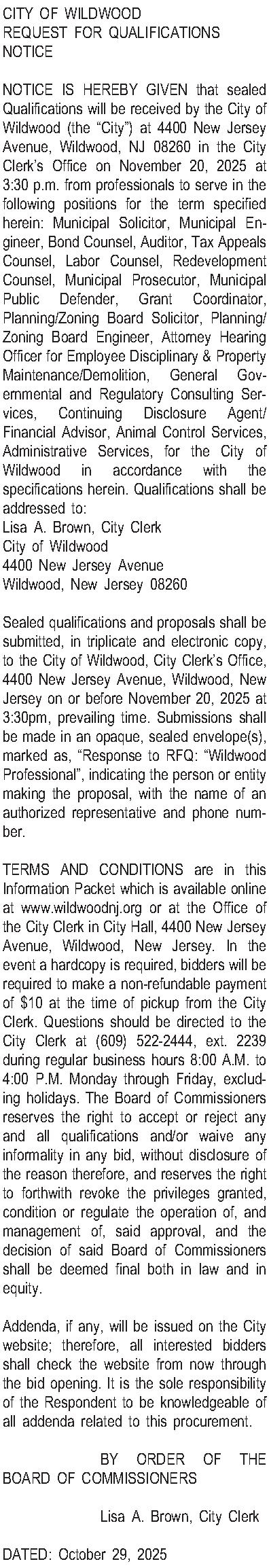CITY OF WILDWOOD REQUEST FOR QUALIFICATIONS NOTICE NOTICE IS HEREBY GIVEN that sealed Qualifications will be received by the City of Wildwood (the City) at 4400 New Jersey Avenue, Wildwood, NJ 08260 in the City Clerks Office on November 20, 2025 at 3:30 p.m. from professionals to serve in the following positions for the term specified herein: Municipal Solicitor, Municipal Engineer, Bond Counsel, Auditor, Tax Appeals Counsel, Labor Counsel, Redevelopment Counsel, Municipal Prosecutor, Municipal Public Defender, Grant Coordinator, Planning/Zoning Board Solicitor, Planning/Zoning Board Engineer, Attorney Hearing Officer for Employee Disciplinary & Property Maintenance/Demolition, General Governmental and Regulatory Consulting Services, Continuing Disclosure Agent/Financial Advisor, Animal Control Services, Administrative Services, for the City of Wildwood in accordance with the specifications herein. Qualifications shall be addressed to: Lisa A. Brown, City Clerk City of Wildwood 4400 New Jersey Avenue Wildwood, New Jersey 08260 Sealed qualifications and proposals shall be submitted, in triplicate and electronic copy, to the City of Wildwood, City Clerks Office, 4400 New Jersey Avenue, Wildwood, New Jersey on or before November 20, 2025 at 3:30pm, prevailing time. Submissions shall be made in an opaque, sealed envelope(s), marked as, Response to RFQ: Wildwood Professional, indicating the person or entity making the proposal, with the name of an authorized representative and phone number. TERMS AND CONDITIONS are in this Information Packet which is available online at www.wildwoodnj.org or at the Office of the City Clerk in City Hall, 4400 New Jersey Avenue, Wildwood, New Jersey. In the event a hardcopy is required, bidders will be required to make a non-refundable payment of $10 at the time of pickup from the City Clerk. Questions should be directed to the City Clerk at (609) 522-2444, ext. 2239 during regular business hours 8:00 A.M. to 4:00 P.M. Monday through Friday, excluding holidays. The Board of Commissioners reserves the right to accept or reject any and all qualifications and/or waive any informality in any bid, without disclosure of the reason therefore, and reserves the right to forthwith revoke the privileges granted, condition or regulate the operation of, and management of, said approval, and the decision of said Board of Commissioners shall be deemed final both in law and in equity. Addenda, if any, will be issued on the City website; therefore, all interested bidders shall check the website from now through the bid opening. It is the sole responsibility of the Respondent to be knowledgeable of all addenda related to this procurement. BY ORDER OF THE BOARD OF COMMISSIONERS Lisa A. Brown, City Clerk DATED: October 29, 2025