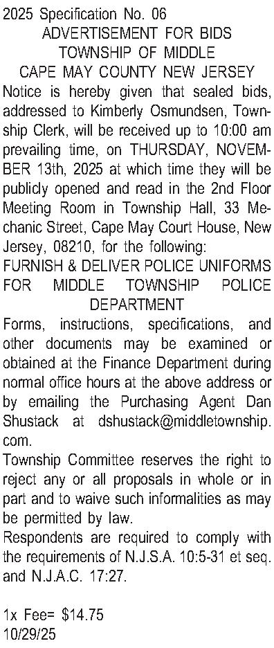2025 Specification No. 06 ADVERTISEMENT FOR BIDS TOWNSHIP OF MIDDLE CAPE MAY COUNTY NEW JERSEY Notice is hereby given that sealed bids, addressed to Kimberly Osmundsen, Township Clerk, will be received up to 10:00 am prevailing time, on THURSDAY, NOVEMBER 13th, 2025 at which time they will be publicly opened and read in the 2nd Floor Meeting Room in Township Hall, 33 Mechanic Street, Cape May Court House, New Jersey, 08210, for the following: FURNISH & DELIVER POLICE UNIFORMS FOR MIDDLE TOWNSHIP POLICE DEPARTMENT Forms, instructions, specifications, and other documents may be examined or obtained at the Finance Department during normal office hours at the above address or by emailing the Purchasing Agent Dan Shustack at dshustack@middletownship.com. Township Committee reserves the right to reject any or all proposals in whole or in part and to waive such informalities as may be permitted by law. Respondents are required to comply with the requirements of N.J.S.A. 10:5-31 et seq. and N.J.A.C. 17:27. 1x Fee= $14.75 10/29/25