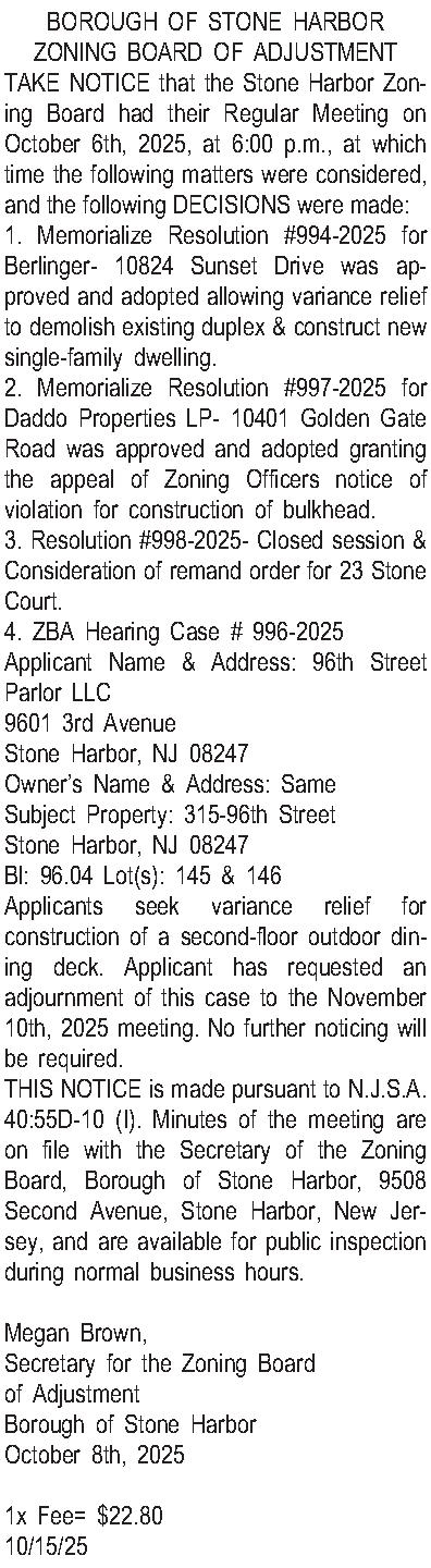 BOROUGH OF STONE HARBOR ZONING BOARD OF ADJUSTMENT TAKE NOTICE that the Stone Harbor Zoning Board had their Regular Meeting on October 6th, 2025, at 6:00 p.m., at which time the following matters were considered, and the following DECISIONS were made: 1. Memorialize Resolution #994-2025 for Berlinger-10824 Sunset Drive was approved and adopted allowing variance relief to demolish existing duplex & construct new single-family dwelling. 2. Memorialize Resolution #997-2025 for Daddo Properties LP-10401 Golden Gate Road was approved and adopted granting the appeal of Zoning Officers notice of violation for construction of bulkhead. 3. Resolution #998-2025- Closed session & Consideration of remand order for 23 Stone Court. 4. ZBA Hearing Case # 996-2025 Applicant Name & Address: 96th Street Parlor LLC 9601 3rd Avenue Stone Harbor, NJ 08247 Owners Name & Address: Same Subject Property: 315-96th Street Stone Harbor, NJ 08247 Bl: 96.04 Lot(s): 145 & 146 Applicants seek variance relief for construction of a second-floor outdoor dining deck. Applicant has requested an adjournment of this case to the November 10th, 2025 meeting. No further noticing will be required. THIS NOTICE is made pursuant to N.J.S.A. 40:55D-10 (I). Minutes of the meeting are on file with the Secretary of the Zoning Board, Borough of Stone Harbor, 9508 Second Avenue, Stone Harbor, New Jersey, and are available for public inspection during normal business hours. Megan Brown, Secretary for the Zoning Board of Adjustment Borough of Stone Harbor October 8th, 2025 1x Fee= $22.80 10/15/25