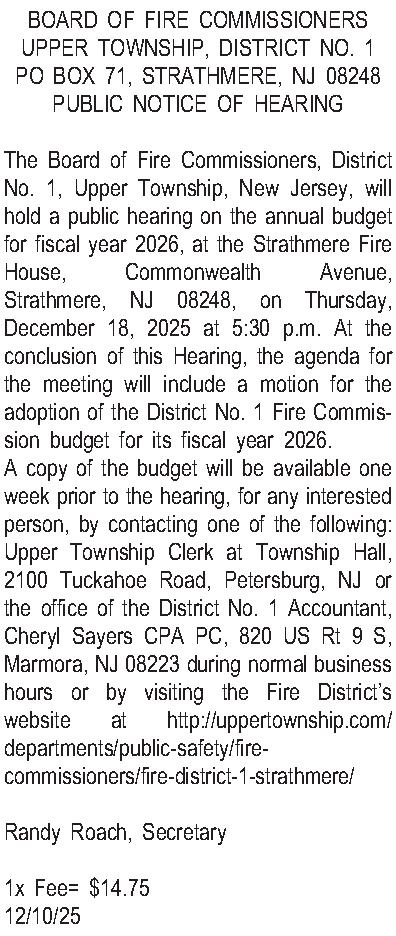 BOARD OF FIRE COMMISSIONERS UPPER TOWNSHIP, DISTRICT NO. 1 PO BOX 71, STRATHMERE, NJ 08248 PUBLIC NOTICE OF HEARING The Board of Fire Commissioners, District No. 1, Upper Township, New Jersey, will hold a public hearing on the annual budget for fiscal year 2026, at the Strathmere Fire House, Commonwealth Avenue, Strathmere, NJ 08248, on Thursday, December 18, 2025 at 5:30 p.m. At the conclusion of this Hearing, the agenda for the meeting will include a motion for the adoption of the District No. 1 Fire Commission budget for its fiscal year 2026. A copy of the budget will be available one week prior to the hearing, for any interested person, by contacting one of the following: Upper Township Clerk at Township Hall, 2100 Tuckahoe Road, Petersburg, NJ or the office of the District No. 1 Accountant, Cheryl Sayers CPA PC, 820 US Rt 9 S, Marmora, NJ 08223 during normal business hours or by visiting the Fire Districts website at