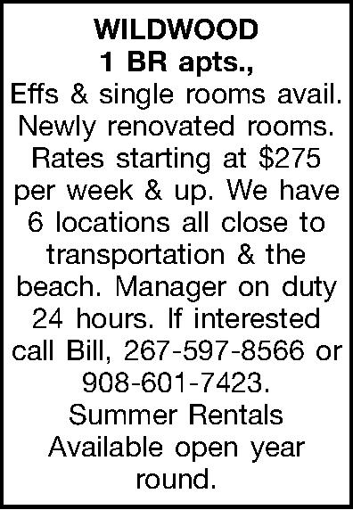 WILDWOOD 1 BR apts., Effs & single rooms avail. Newly renovated rooms. Rates starting at $275 per week & up. We have 6 locations all close to transportation & the beach. Manager on duty 24 hours. If interested call Bill, 267-597-8566 or 908-601-7423. Summer Rentals Available open year round.
