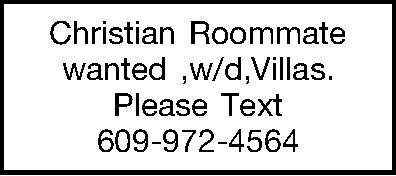 Christian Roommate wanted ,w/d,Villas. Please Text 609-972-4564
