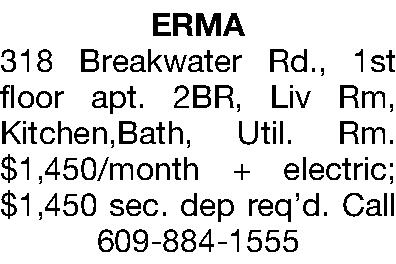 ERMA 318 Breakwater Rd., 1st floor apt. 2BR, Liv Rm, Kitchen,Bath, Util. Rm. $1,450/month + electric; $1,450 sec. dep reqd. Call 609-884-1555