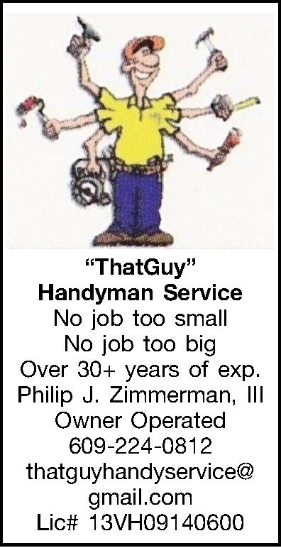 ThatGuy Handyman Service No job too small No job too big Over 30+ years of exp. Philip J. Zimmerman, III Owner Operated 609-224-0812 thatguyhandyservice@ gmail.com Lic# 13VH09140600