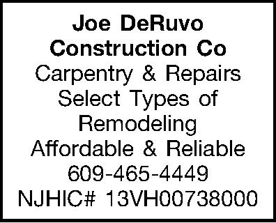 Joe DeRuvo Construction Co Carpentry & Repairs Select Types of Remodeling Affordable & Reliable 609-465-4449 NJHIC# 13VH00738000