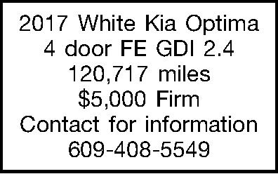 2017 White Kia Optima 4 door FE GDI 2.4 120,717 miles $5,000 Firm Contact for information 609-408-5549