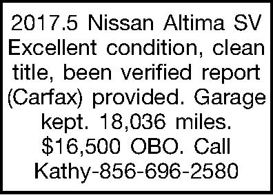 2017.5 Nissan Altima SV Excellent condition, clean title, been verified report (Carfax) provided. Garage kept. 18,036 miles. $16,500 OBO. Call Kathy-856-696-2580