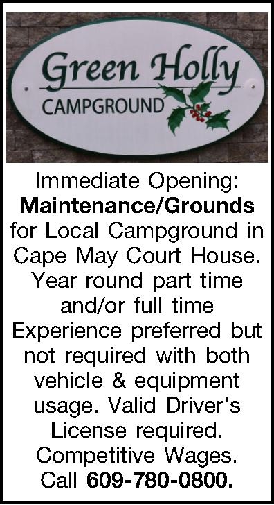 Immediate Opening: Maintenance/Grounds for Local Campground in Cape May Court House. Year round part time and/or full time Experience preferred but not required with both vehicle & equipment usage. Valid Drivers License required. Competitive Wages. Call 609-780-0800.