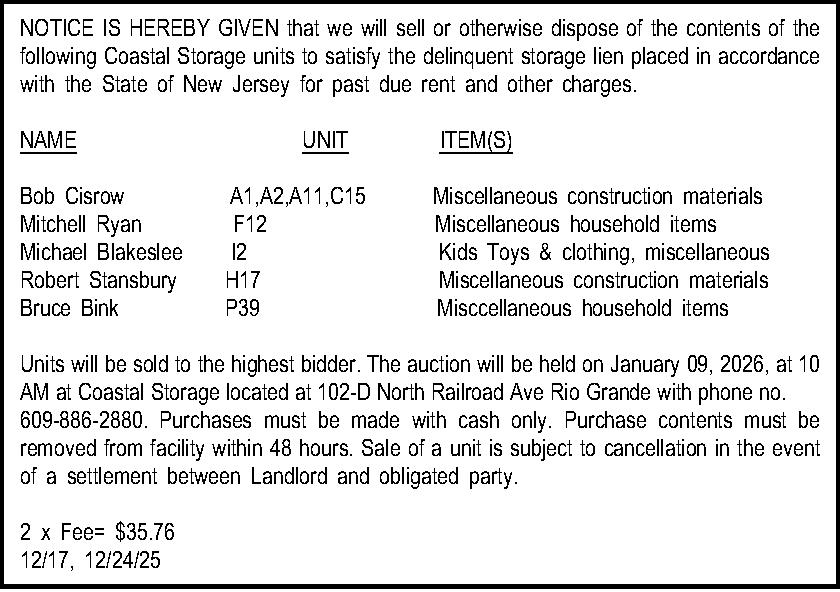 NOTICE IS HEREBY GIVEN that we will sell or otherwise dispose of the contents of the following Coastal Storage units to satisfy the delinquent storage lien placed in accordance with the State of New Jersey for past due rent and other charges. NAME UNIT ITEM(S) Bob Cisrow A1,A2,A11,C15 Miscellaneous construction materials Mitchell Ryan F12Miscellaneous household items Michael BlakesleeI2Kids Toys & clothing, miscellaneous Robert StansburyH17 Miscellaneous construction materials Bruce Bink P39 Misccellaneous household items Units will be sold to the highest bidder. The auction will be held on January 09, 2026, at 10 AM at Coastal Storage located at 102-D North Railroad Ave Rio Grande with phone no. 609-886-2880. Purchases must be made with cash only. Purchase contents must be removed from facility within 48 hours. Sale of a unit is subject to cancellation in the event of a settlement between Landlord and obligated party. 2 x Fee= $35.76 12/17, 12/24/25