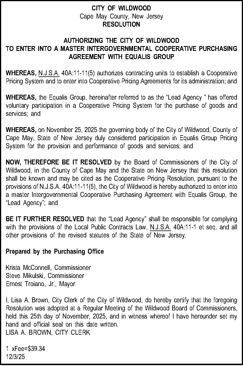 CITY OF WILDWOOD Cape May County, New Jersey RESOLUTION AUTHORIZING THE CITY OF WILDWOOD TO ENTER INTO A MASTER INTERGOVERNMENTAL COOPERATIVE PURCHASING AGREEMENT WITH EQUALIS GROUP WHEREAS, N.J.S.A. 40A:11-11(5) authorizes contracting units to establish a Cooperative Pricing System and to enter into Cooperative Pricing Agreements for its administration; and WHEREAS, the Equalis Group, hereinafter referred to as the Lead Agency has offered voluntary participation in a Cooperative Pricing System for the purchase of goods and services; and WHEREAS, on November 25, 2025 the governing body of the City of Wildwood, County of Cape May, State of New Jersey duly considered participation in Equalis Group Pricing System for the provision and performance of goods and services; and NOW, THEREFORE BE IT RESOLVED by the Board of Commissioners of the City of Wildwood, in the County of Cape May and the State on New Jersey that this resolution shall be known and may be cited as the Cooperative Pricing Resolution, pursuant to the provisions of N.J.S.A. 40A:11-11(5), the City of Wildwood is hereby authorized to enter into a master Intergovernmental Cooperative Purchasing Agreement with Equalis Group, the Lead Agency; and BE IT FURTHER RESOLVED that the Lead Agency shall be responsible for complying with the provisions of the Local Public Contracts Law, N.J.S.A. 40A:11-1 et seq. and all other provisions of the revised statutes of the State of New Jersey. Prepared by the Purchasing Office Krista McConnell, Commissioner Steve Mikulski, Commissioner Ernest Troiano, Jr., Mayor I, Lisa A. Brown, City Clerk of the City of Wildwood, do hereby certify that the foregoing Resolution was adopted at a Regular Meeting of the Wildwood Board of Commissioners, held this 25th day of November, 2025, and in witness whereof I have hereunder set my hand and official seal on this date written. LISA A. BROWN, CITY CLERK 1 xFee=$39.34 12/3/25