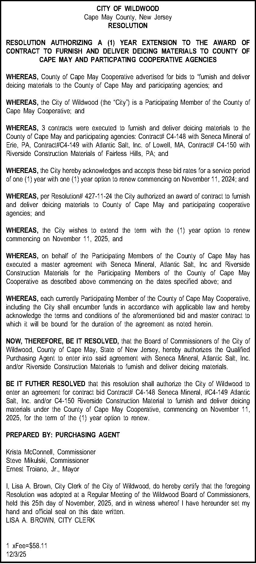 CITY OF WILDWOOD Cape May County, New Jersey RESOLUTION RESOLUTION AUTHORIZING A (1) YEAR EXTENSION TO THE AWARD OF CONTRACT TO FURNISH AND DELIVER DEICING MATERIALS TO COUNTY OF CAPE MAY AND PARTICPATING COOPERATIVE AGENCIES WHEREAS, County of Cape May Cooperative advertised for bids to furnish and deliver deicing materials to the County of Cape May and participating agencies; and WHEREAS, the City of Wildwood (the City) is a Participating Member of the County of Cape May Cooperative; and WHEREAS, 3 contracts were executed to furnish and deliver deicing materials to the County of Cape May and participating agencies: Contract# C4-148 with Seneca Mineral of Erie, PA, Contract#C4-149 with Atlantic Salt, Inc. of Lowell, MA, Contract# C4-150 with Riverside Construction Materials of Fairless Hills, PA; and WHEREAS, the City hereby acknowledges and accepts these bid rates for a service period of one (1) year with one (1) year option to renew commencing on November 11, 2024; and WHEREAS, per Resolution# 427-11-24 the City authorized an award of contract to furnish and deliver deicing materials to County of Cape May and participating cooperative agencies; and WHEREAS, the City wishes to extend the term with the (1) year option to renew commencing on November 11, 2025, and WHEREAS, on behalf of the Participating Members of the County of Cape May has executed a master agreement with Seneca Mineral, Atlantic Salt, Inc and Riverside Construction Materials for the Participating Members of the County of Cape May Cooperative as described above commencing on the dates specified above; and WHEREAS, each currently Participating Member of the County of Cape May Cooperative, including the City shall encumber funds in accordance with applicable law and hereby acknowledge the terms and conditions of the aforementioned bid and master contract to which it will be bound for the duration of the agreement as noted herein. NOW, THEREFORE, BE IT RESOLVED, that the Board of Commissioners of the City of Wildwood, County of Cape May, State of New Jersey, hereby authorizes the Qualified Purchasing Agent to enter into said agreement with Seneca Mineral, Atlantic Salt, Inc. and/or Riverside Construction Materials to furnish and deliver deicing materials. BE IT FUTHER RESOLVED that this resolution shall authorize the City of Wildwood to enter an agreement for contract bid Contract# C4-148 Seneca Mineral, #C4-149 Atlantic Salt, Inc. and/or C4-150 Riverside Construction Material to furnish and deliver deicing materials under the County of Cape May Cooperative, commencing on November 11, 2025, for the term of the (1) year option to renew. PREPARED BY: PURCHASING AGENT Krista McConnell, Commissioner Steve Mikulski, Commissioner Ernest Troiano, Jr., Mayor I, Lisa A. Brown, City Clerk of the City of Wildwood, do hereby certify that the foregoing Resolution was adopted at a Regular Meeting of the Wildwood Board of Commissioners, held this 25th day of November, 2025, and in witness whereof I have hereunder set my hand and official seal on this date written. LISA A. BROWN, CITY CLERK 1 xFee=$58.11 12/3/25