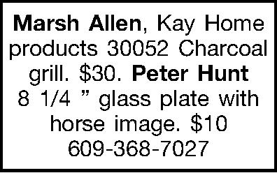 Marsh Allen, Kay Home products 30052 Charcoal grill. $30. Peter Hunt 8 1/4 glass plate with horse image. $10 609-368-7027