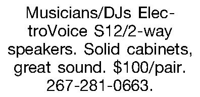 Musicians/DJs ElectroVoice S12/2-way speakers. Solid cabinets, great sound. $100/pair. 267-281-0663.
