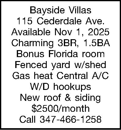 Bayside Villas 115 Cederdale Ave. Available Nov 1, 2025 Charming 3BR, 1.5BA Bonus Florida room Fenced yard w/shed Gas heat Central A/C W/D hookups New roof & siding $2500/month Call 347-466-1258