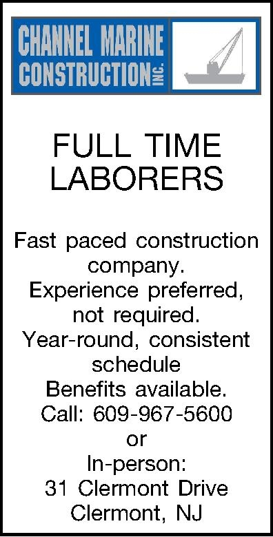 FULL TIME LABORERS Fast paced construction company. Experience preferred, not required. Year-round, consistent schedule Benefits available. Call: 609-967-5600 or In-person: 31 Clermont Drive Clermont, NJ