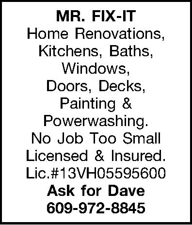 MR. FIX-IT Home Renovations, Kitchens, Baths, Windows, Doors, Decks, Painting & Powerwashing. No Job Too Small Licensed & Insured. Lic.#13VH05595600 Ask for Dave 609-972-8845