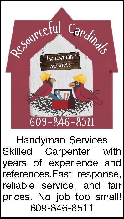 Handyman Services Skilled Carpenter with years of experience and references.Fast response, reliable service, and fair prices. No job too small! 609-846-8511
