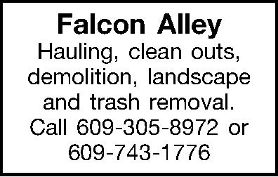 Falcon Alley Hauling, clean outs, demolition, landscape and trash removal. Call 609-305-8972 or 609-743-1776