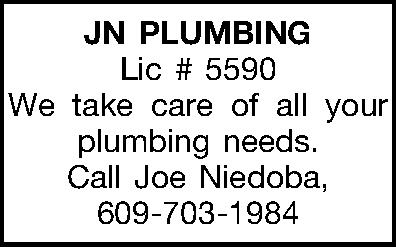 JN PLUMBING Lic # 5590 We take care of all your plumbing needs. Call Joe Niedoba, 609-703-1984